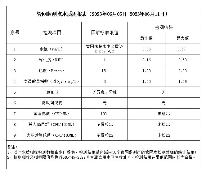 管網(wǎng)監(jiān)測點水質周報表(2023年06月05日-2023年06月11日)