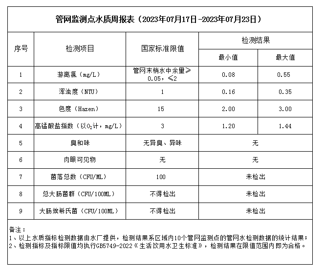 管網監測點水質周報表(2023年07月17日-2023年07月23日)