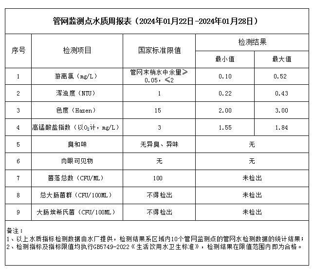 管網(wǎng)監(jiān)測點(diǎn)水質(zhì)周報(bào)表(2024年01月22日-2024年01月28日)