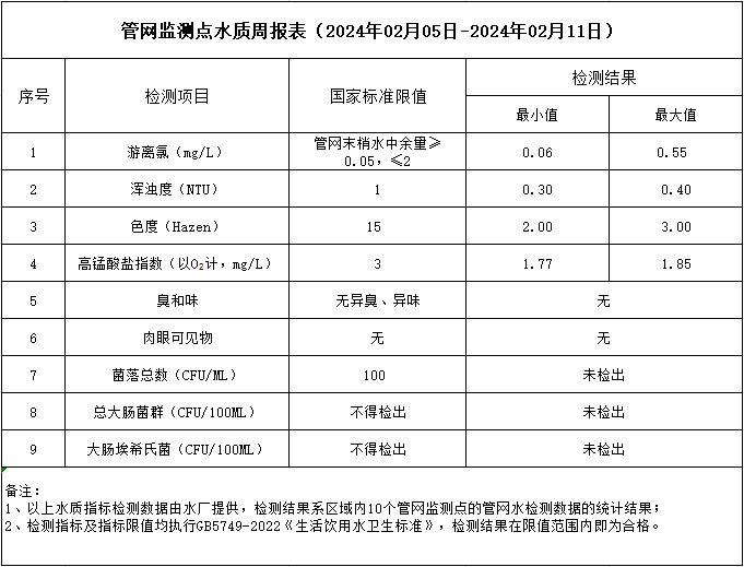 管網監測點水質周報表(2024年02月05日-2024年02月11日)