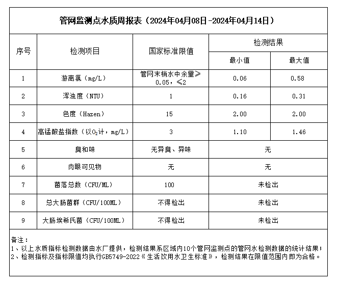 管網(wǎng)監(jiān)測(cè)點(diǎn)水質(zhì)周報(bào)表(2024年04月08日-2024年04月14日)