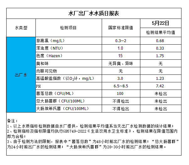 水廠(chǎng)出廠(chǎng)水水質(zhì)日?qǐng)?bào)表(2024-5-22)