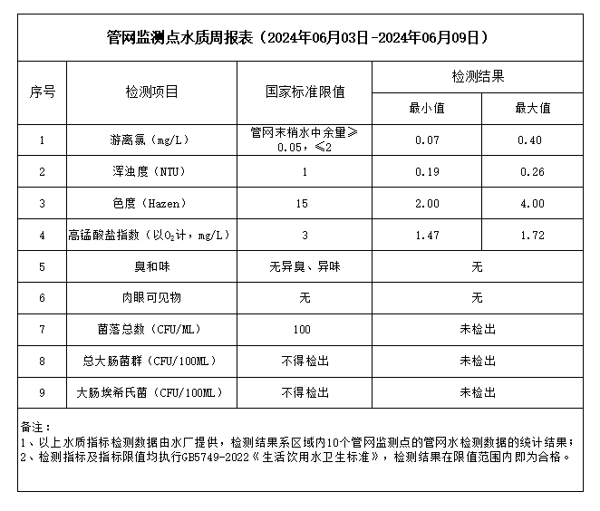管網(wǎng)監(jiān)測點(diǎn)水質(zhì)周報(bào)表(2024年06月03日-2024年06月09日)