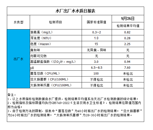 水廠出廠水水質日報表(2024-9-26)